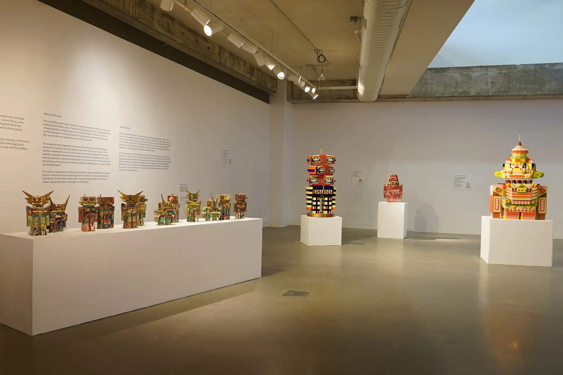Studio REBORN flowered from this practice, repurposing traditional aesthetics to produce futuristic, geometric sculptures featuring time-honored East Asian painting and lacquering techniques. Equal parts action figures and idols, these vibrant deities evoke a unique spiritualism, mythology, and philosophy. Every sculpture is accompanied by a poem; a homage to the storytelling of Kumkum’s grandmother, shared with him as a child in her beloved gardens.